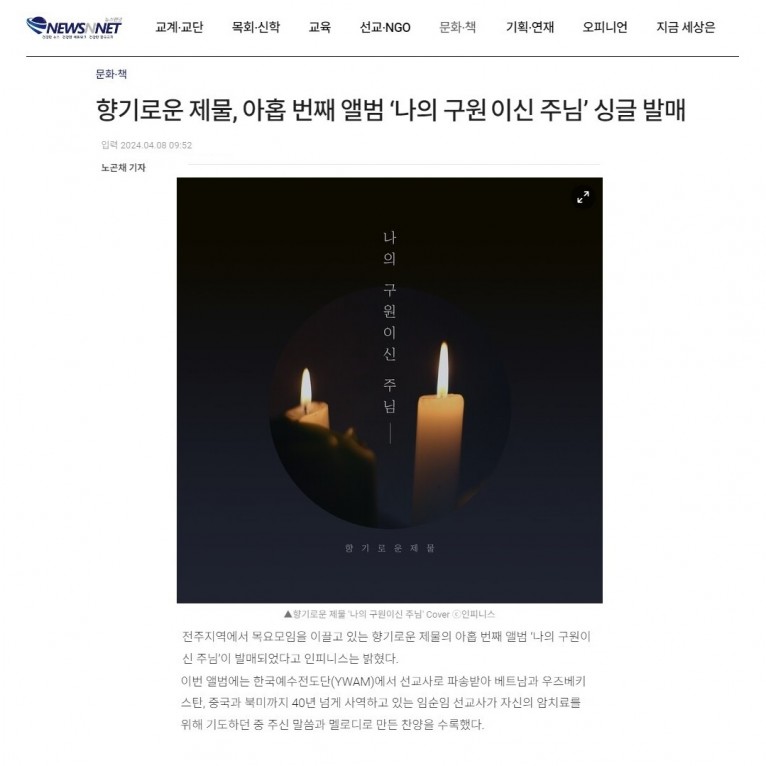 뮤직타임 [기사] 향기로운 제물, 아홉 번째 앨범 ‘나의 구원이신 주님’ 싱글 발매(뉴스앤넷)