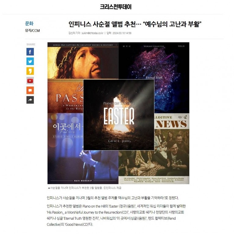 인피니스가 추천한 앨범은 Piano on the Hill의 ‘Easter (정규)(음원)’, 세계적인 워십 리더들이 함께 발매한 ‘His Passion_ a Worshipful Journey to the Resurrection(CD)’, 사랑의교회 쉐키나 찬양단의 사랑의교회 쉐키나 싱글 ‘Eternal Truth 영원한 진리’, 나비워십의 ‘이 곳에서(싱글)(음원)’, 렌드 컬렉티브(Rend Collective)의 ‘Good News(CD)’다.