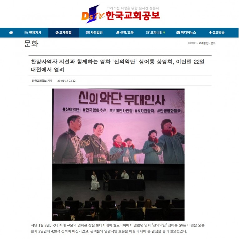 [기사] 찬양사역자 지선과 함께하는 영화 '신의악단' 싱어롱 상영회, 이번엔 22일 대전에서 열려(한국교회공보)