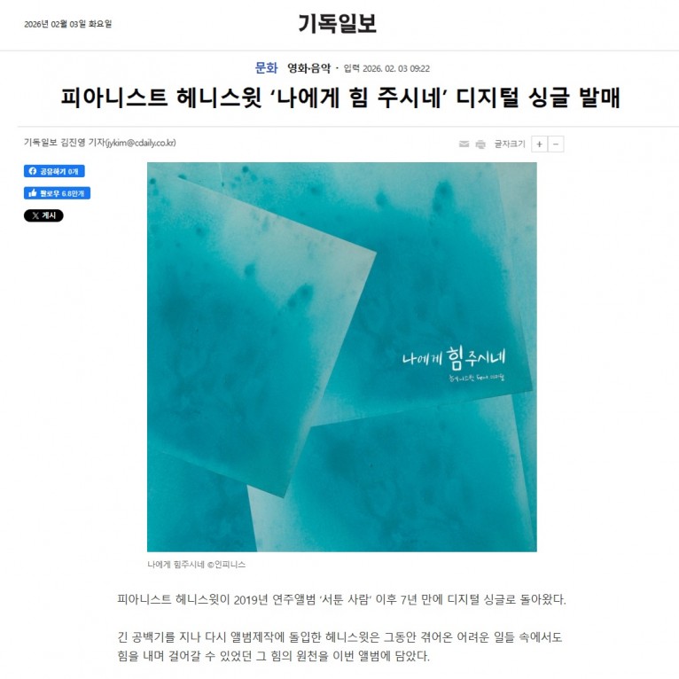 [기사] 피아니스트 헤니스윗 ‘나에게 힘 주시네’ 디지털 싱글 발매(기독일보)