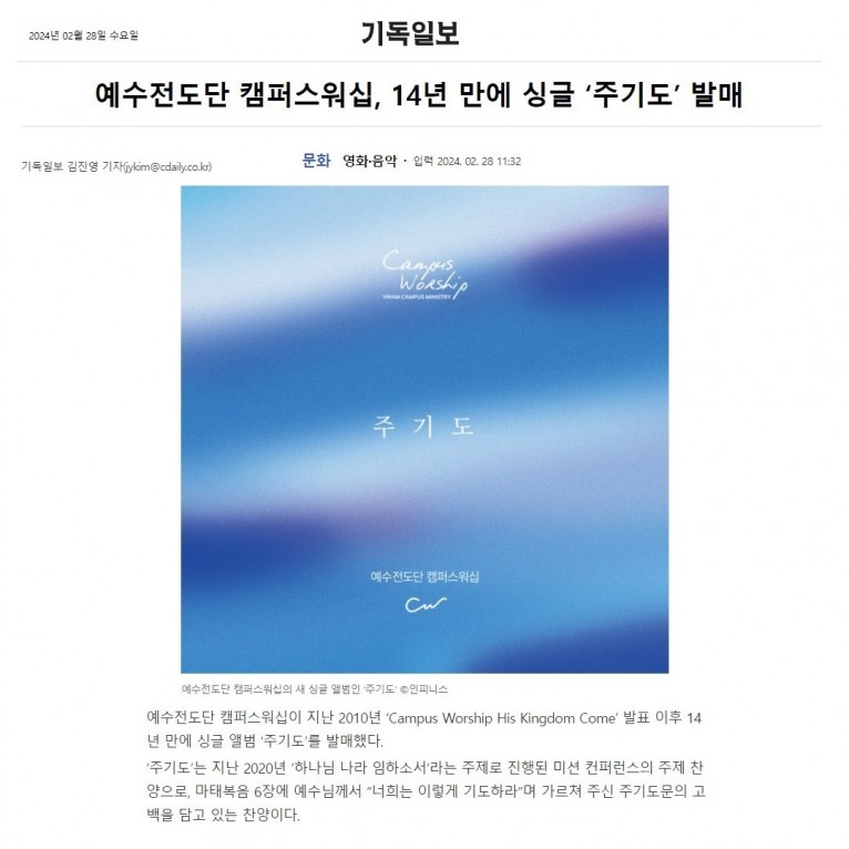 [기사] 예수전도단 캠퍼스워십, 14년 만에 싱글 ‘주기도’ 발매(기독일보)