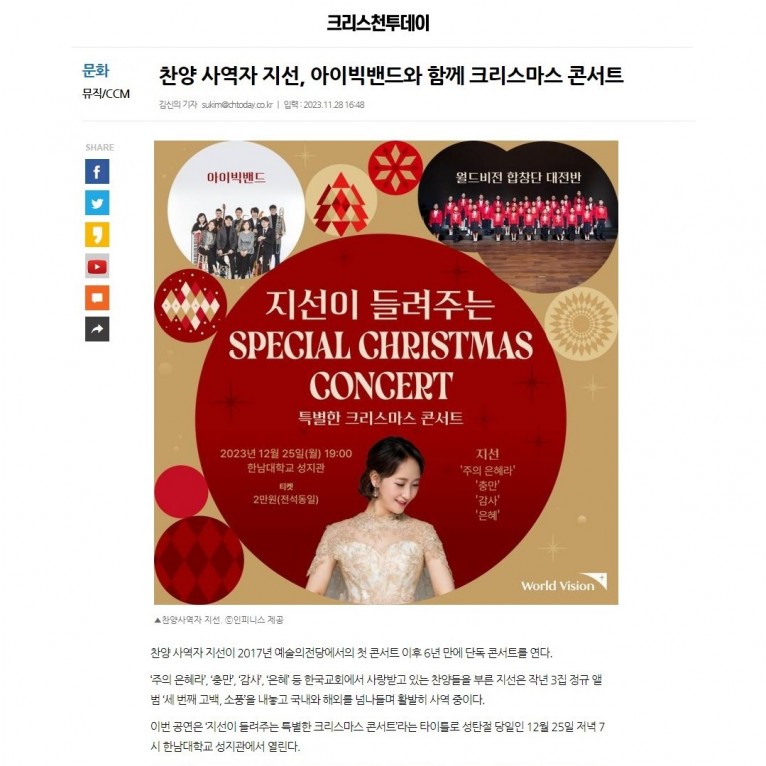 [기사] 찬양 사역자 지선, 아이빅밴드와 함께 크리스마스 콘서트(크리스천투데이)