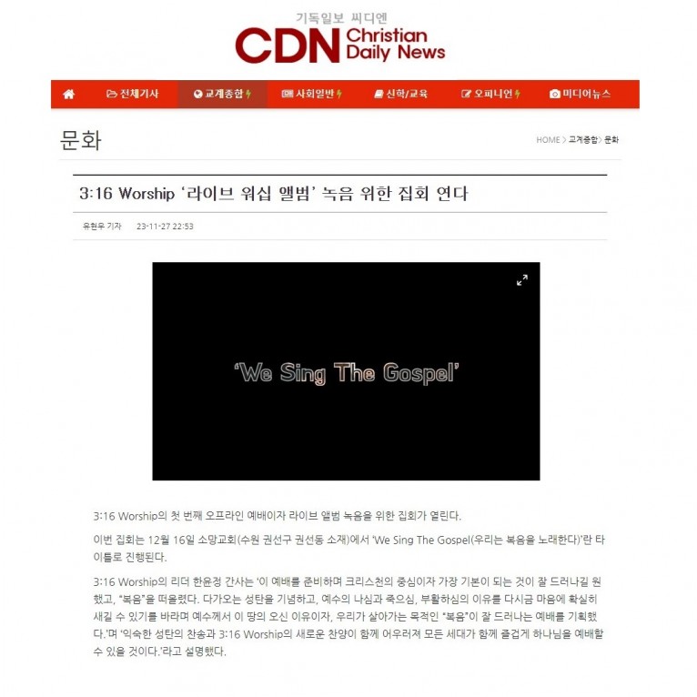 [기사] 3:16 Worship ‘라이브 워십 앨범’ 녹음 위한 집회 연다 (기독일보 씨디엔)