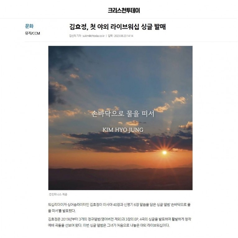 [기사] 김효정, 첫 야외 라이브워십 싱글 발매(크리스천투데이)
