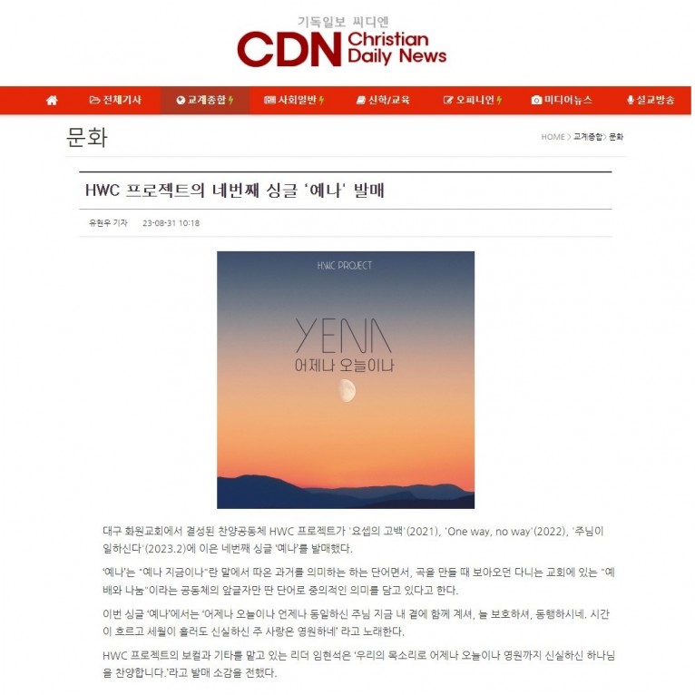 대구 화원교회에서 결성된 찬양공동체 HWC 프로젝트가 '요셉의 고백'(2021), 'One way, no way'(2022), '주님이 일하신다'(2023.2)에 이은 네번째 싱글 ‘예나’를 발매했다.