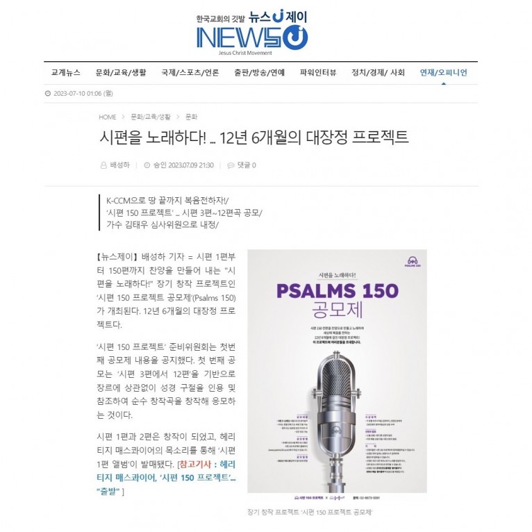 【뉴스제이】 배성하 기자 = 시편 1편부터 150편까지 찬양을 만들어 내는 "시편을 노래하다!" 장기 창작 프로젝트인 ‘시편 150 프로젝트 공모제’(Psalms 150)가 개최된다. 12년 6개월의 대장정 프로젝트다.