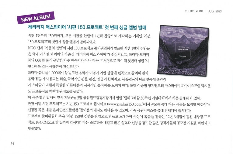 [잡지] 헤리티지 매스콰이어, '시편 150 프로젝트' 첫 번째 싱글앨범 발매(월간 Church Media 7월호)