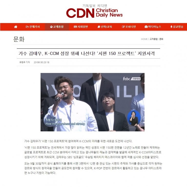 [기사] 가수 김태우, K-CCM 성장 위해 나선다! ‘시편 150 프로젝트’ 지원사격(기독일보 씨디엔)