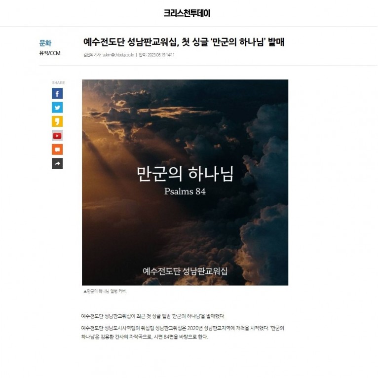 [기사] 예수전도단 성남판교워십, 첫 싱글 ‘만군의 하나님’ 발매(크리스천투데이)