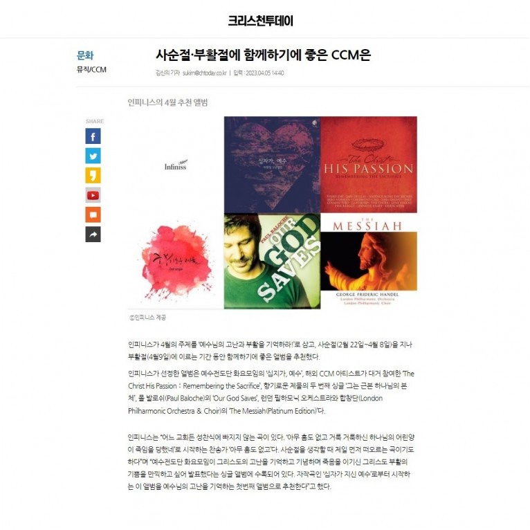 인피니스가 4월의 주제를 ‘예수님의 고난과 부활을 기억하라!’로 삼고, 사순절(2월 22일~4월 8일)을 지나 부활절(4월9일)에 이르는 기간 동안 함께하기에 좋은 앨범을 추천했다.