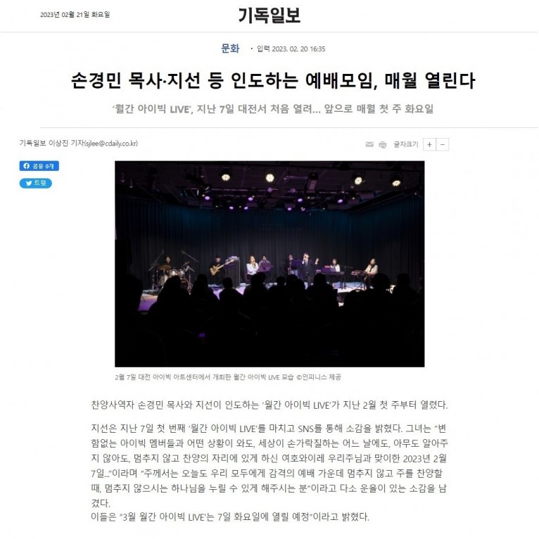[기사] 손경민 목사·지선 등 인도하는 예배모임, 매월 열린다(기독일보)