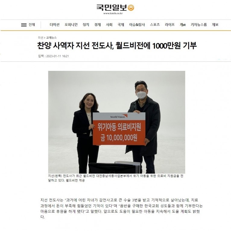 [기사] 찬양 사역자 지선 전도사, 월드비전에 1000만원 기부