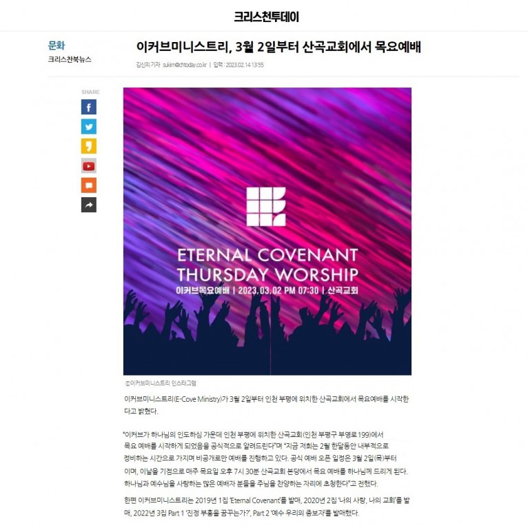 [기사] 이커브미니스트리, 3월 2일부터 산곡교회에서 목요예배
