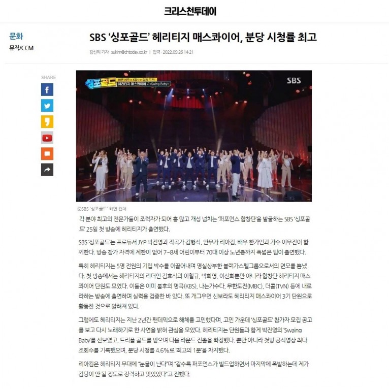 [기사] SBS ‘싱포골드’ 헤리티지 매스콰이어, 분당 시청률 최고