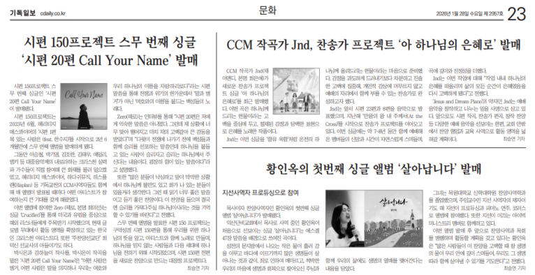 [기사] CCM 작곡가인 Jnd, ‘아 하나님의 은혜로’ 발매(기독일보)