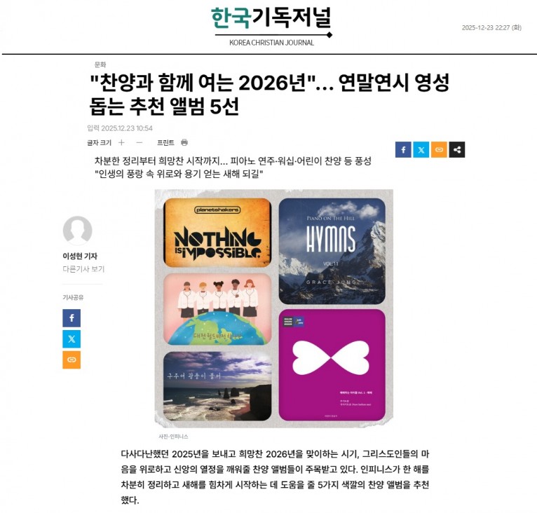 뮤직타임 [기획기사] 찬양과 함께 여는 2026년… 연말연시 영성 돕는 추천 앨범 5선(한국기독저널)