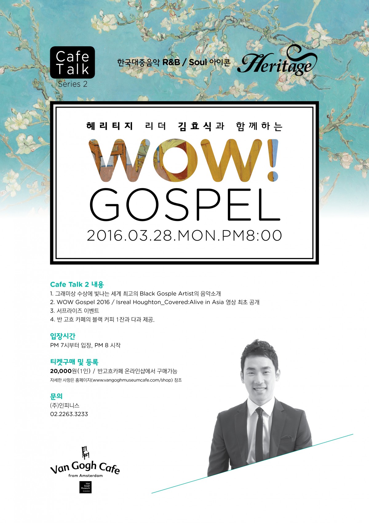 반 고흐 카페가 마련한 특별 문화예술 이벤트인 [카페 토크 시리즈] 2탄으로 한국 대중음악 R&B Soul의 아이콘인 Heritage 팀과 함께 Black Gospel의 세계로 초대합니다.