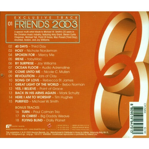 1. Various Artists - Friends 2003 2. 40 Days - Third Day 3. Holy - Nichole Nordeman 4. Spoken For - Mercy Me 5. Irene - TobyMac 6. By Surprise - Joy Williams 7. Ocean Floor - Audio Adrenaline 8. Come Unto Me - Nicole C. Mullen 9. Revolution - Jars of Clay 10. Song Of Love - Rebecca St. James 11. Great Light Of The World - Bebo Norman 12. Yes, I Believe - Point of Grace 13. Back In His Arms Again - Tim Hughes 15. Purified - Michael W. Smith