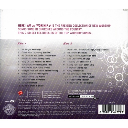 플레티넘 판매고를 기록한 [I Could Sing Of Your Love Forever]에 이어 Worship Together가 선보이는 새로운 모던 워십 모음집 [Here I Am To Worship 시리즈] 두번째 컬렉션. 현재 전세계적으로 각광받고 있는 모던 워십 25곡을 두장의 CD에 담았다. 지구촌 교회 안에서 가장 많이 불려지는 모던워십뿐만 아니라, "Filled With Your Glory" (Starfield), "Rain Down" (Delirious), "Spirit Waltz" (Something Like Silas) 등의 비교적 최신 앨범에 수록되었던 뮤지션들의 파워 워십까지 담고 있다. 딜리리어스, 크리스 탐린, 찰리 홀, 레베카 St. 제임스 등 모던 워십의 선두주자들과 더불어 최근 각광받고 있는 Shawn McDonald 등의 탄탄한 신규 아티스트까지의 고른 포진 또한 눈여겨 볼만한 앨범이다.