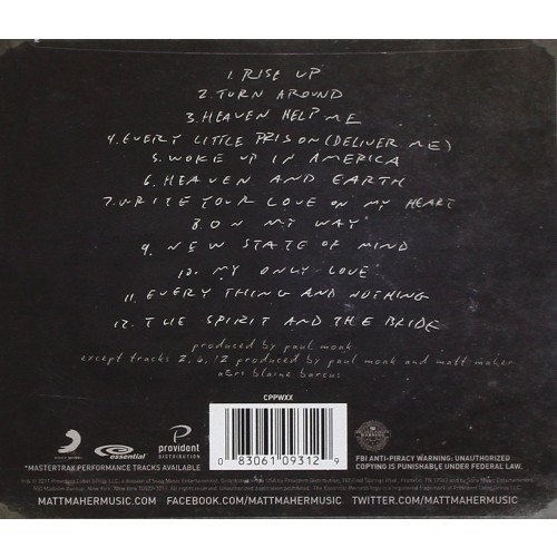 Critically acclaimed Catholic singer/songwriter/worship leader Matt Maher shares the depths of suffering, grace, redemption, and hope---all wrapped in his trademark "blue collar gospel" sound! Includes the radio single "Turn Around," "Rise Up," "Heaven Help Me," "Write Your Love on My Heart," "New State of Mind," "My Only Love," "Everything and Nothing," and "The Spirit and the Bride."