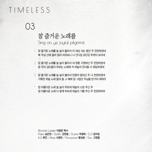 이번 앨범 ‘Timeless’는 제목 그대로 알파와 오메가, 처음과 나중 되시는 성삼위 하나님의 영원성을 담고 있다. 또한, 시대가 지나고 세대가 바뀌어도 변하지 않는 진리, 시간을 초월하는 복음의 영광을 선포하는 의미에서도 이 앨범이 담아내고 있는 찬양의 내용들은 영원하다. 영원한 생명은 예수 그리스도를 아는 것과 유일하신 참 하나님을 아는 것에 의해 주어진다. 십자가에서 죽으시고 부활하신 예수님을 믿을 때 영원한 생명은 실체가 된다. 타이틀곡인 ‘잠시 세상에’를 통해 이 땅 위에 살아가는 모든 성도들이 껍데기 예배가 아닌 믿음의 실체로 삶의 예배를 드리며 진리를 수호하는 참된 그리스도의 제자로 거듭나기를 소망한다.