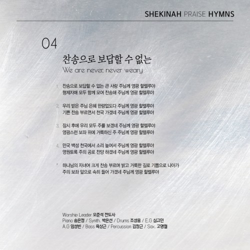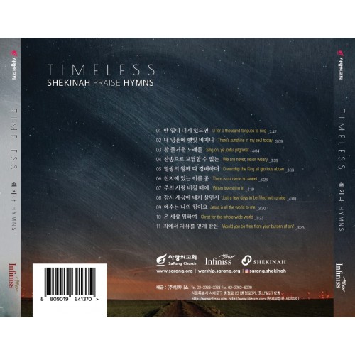 사랑의교회 공예배를 섬기는 쉐키나 찬양단의 정규 찬송가 3집 앨범 ‘Timeless’가 발매되었다. 영원히 경배 받기 합당하신 하나님께 ‘만 입이 내게 있으면’의 고백으로 시작해 예수 그리스도의 구원의 은혜를 자유와 기쁨으로 찬양하게 하는 ‘죄에서 자유를’까지 11개의 트랙으로 하나님의 구속사를 향한 기쁨과 감사의 찬양이 담긴 앨범이다.